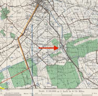 From his Military Medal citation he was on the SW corner of the forest. While the Regimental diary does not give exact map refs, a reasonable reconstruction places the gun line along the forest edge facing the open fields to the SW (see Map 01: 1:50,000 Forêt de Nieppe, 1937–38).