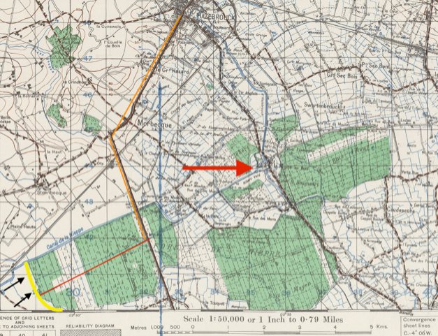 Map annotation: Yellow = gun line; Black Arrows = German Advance; Red line = track to the D916; Red arrow = BHQ; Orange Line = Route to Hazebrouck